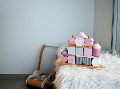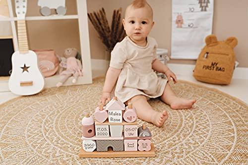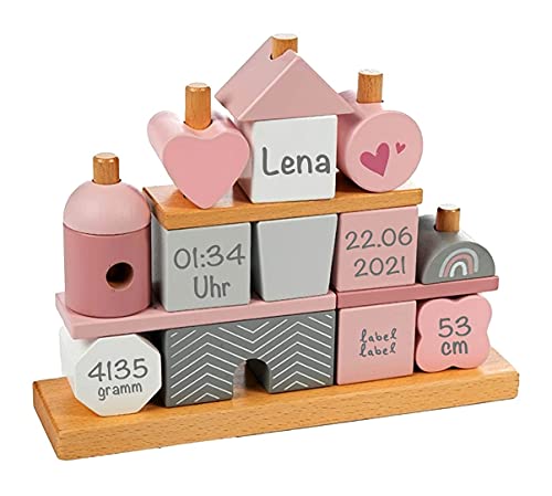 LABEL LABEL STAPELSPIEL – STECKSPIEL HAUS IN ROSA | PERSONALISIERBAR MIT GEBURTSDATEN UND NAME