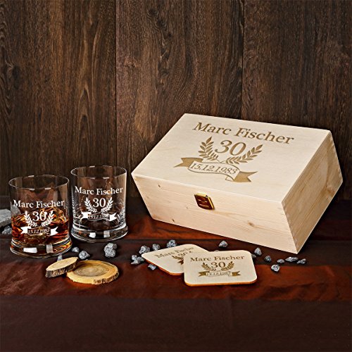 Set-Inhalt: Holzkiste (25 x 7,4 x 14 cm) 2 Untersetzter (9 x9 cm) und 2 Whiskygläser Leonardo inkl. Ihrer persönlichen Namensgravur