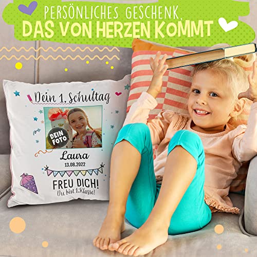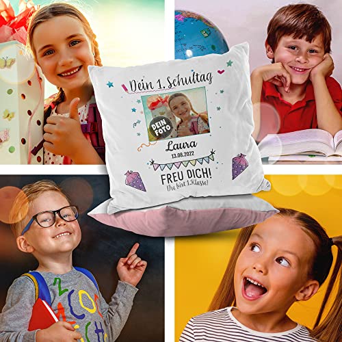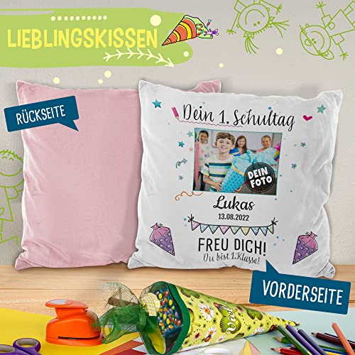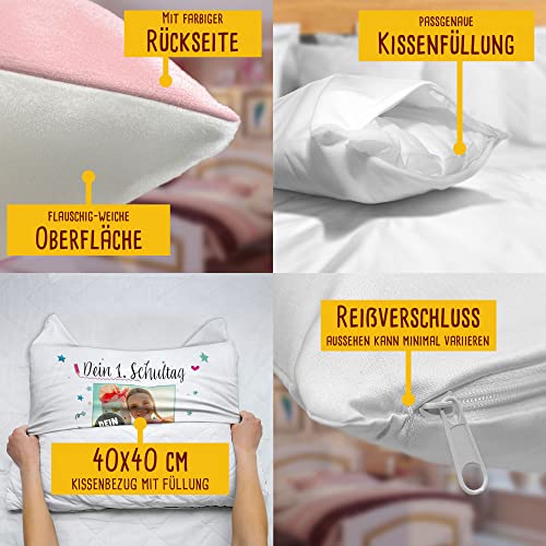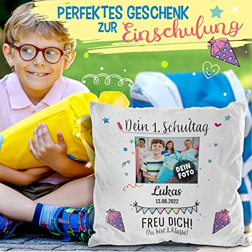 Hochwertig bedrucktes Kissen mit Wunschname, Datum und Foto des Schulkindes zum ersten Schultag. Das perfekte Geschenk für alle Schulanfänger. Eine persönliche Geschenkidee für Jungen und Mädchen – eine tolle Erinnerung und schöner als jede Glückwunschkarte.