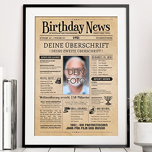 Details: PRINTALA Geburtstagszeitung – personalisiert mit Deinem Text & Foto | Jahrgang nach Wahl | Posterdruck (1951)