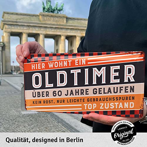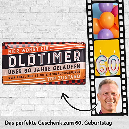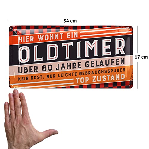 FREUDE SCHENKEN mit dem witzigen Schild zum 60. Geburtstag Mann. Das „Hier wohnt ein Oldtimer“ Blechschild passt perfekt als Geburtstagsdeko für Männer und später als Wanddeko in die Werkstatt oder Garage neben den Oldtimer.