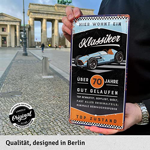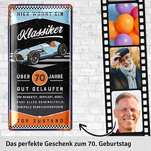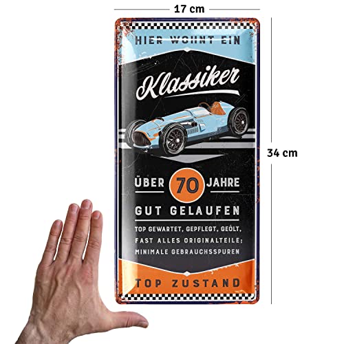 FREUDE SCHENKEN mit dem witzigen Schild zum 70. Geburtstag Mann. Das „Hier wohnt ein Klassiker“ Blechschild passt perfekt als Geburtstagsdeko für Männer und später als Wanddeko in die Werkstatt oder Garage neben den Oldtimer.