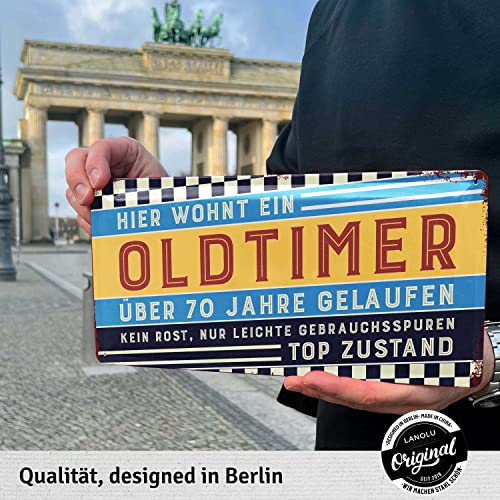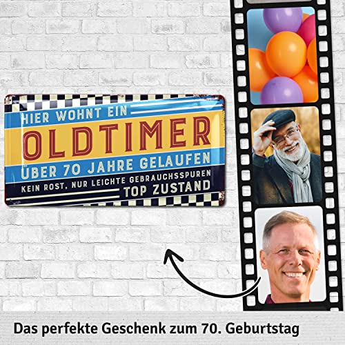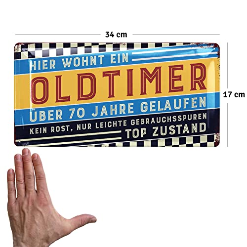 FREUDE SCHENKEN mit dem witzigen Schild zum 70. Geburtstag Mann. Das „Hier wohnt ein Oldtimer“ Blechschild passt perfekt als Geburtstagsdeko für Männer und später als Wanddeko in die Werkstatt oder Garage neben den Oldtimer.