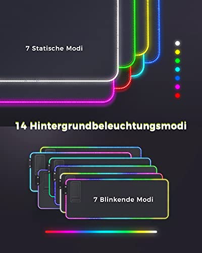 【14 LED Beleuchtungsmodus】Das Seenda Gaming Mauspad verfügt über 7 statische Modi: Rot, Blau, Grün, Lila, Cyan, Gelb, Weiß und 7 Blinkmodi: Wechselwelle, Synchronwelle, Wechselblinken, Rotwechsel, Aus, Synchronatmung, Wechsel Atmung, insgesamt 14 Hintergrundbeleuchtungsmodi. Ein Seenda 800×300 Mauspad LED bietet Ihnen 14 visuelle Erlebnisse.