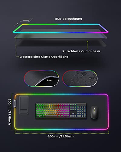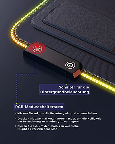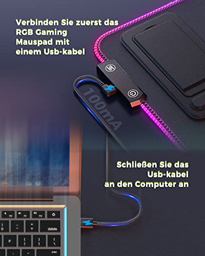 【Wasserdicht Rutschfest】Die glatte Oberfläche des Wasserdichtes Mausmattes LED kann die Reibung der Hände wirksam reduzieren und eine schnelle und stabile Verwendung der Maus gewährleisten. Die wasserdichte Beschichtung kann Schäden am LED Mousepad Gaming verhindern, die durch Flüssigkeiten wie Getränke verursacht werden. Die rutschfeste Gummibasis verhindert das Verrutschen des xxl Mousepads RGB und sorgt für maximale Arbeitseffizienz / Spielerfahrung.