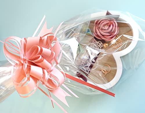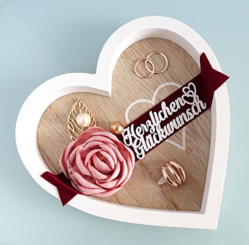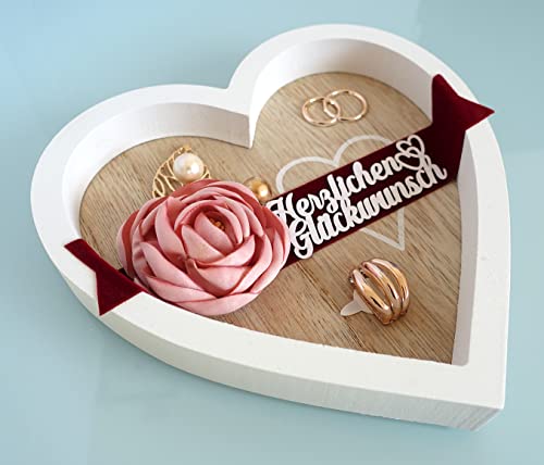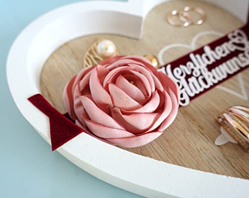 💖 Das in Herzform und Weiß/Buchenholz-Optik gestaltete Tablett mit einer handgefertigten Blume aus Satin wirkt sehr elegant. Auf dunklem Samtband leuchtet die weiße Aufschrift „Herzlichen Glückwunsch“. Durch den Kontrast mit dem dunklen Samtband kommt der rosa Ton der Blume sehr schön zur Geltung.