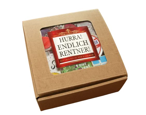 ✅Geriffelte Geschenkbox (21x21x8cm) mit Sticker „HURRA! Endlich Rentner! Ruh Dich aus. Du hast es verdient!“ gefüült mit den folgenden Rente Geschenken