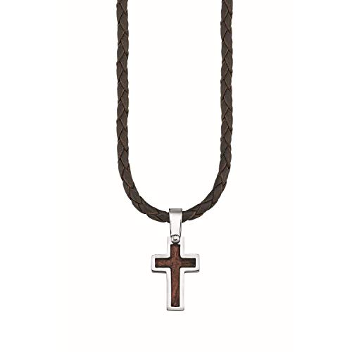Die Halskette besteht aus dunkelbraunem geflochtenem Leder und der Anhänger ist ca. 2,6 cm lang und besteht aus Edelstahl und Holz
