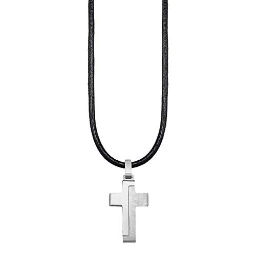 Diese schwarze Halskette samt Kreuzanhänger ergänzt jeden lässigen Look stilecht durch sein cooles Design mit matten Details. Der Halsschmuck für Jungs besteht aus Edelstahl und kommt an der 43 cm langen, variabel (40+3 cm) einstellbaren Kalbslederkette besonders gut zur Geltung. Ein Kreuz um den Hals kann sowohl als modisches als auch religiöses Statement getragen werden.