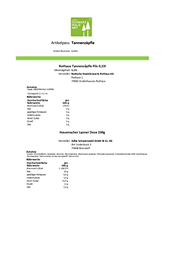 Holzsteige gefüllt mit: „Adler“ Schwarzwälder Schinken Vesperscheibe 150g „Adler“ Hausmacher Lyoner Dose 200g „Adler“ Gourmet-Landjäger 1Paar „Rothaus“ Tannenzäpfle Pils 0,33l