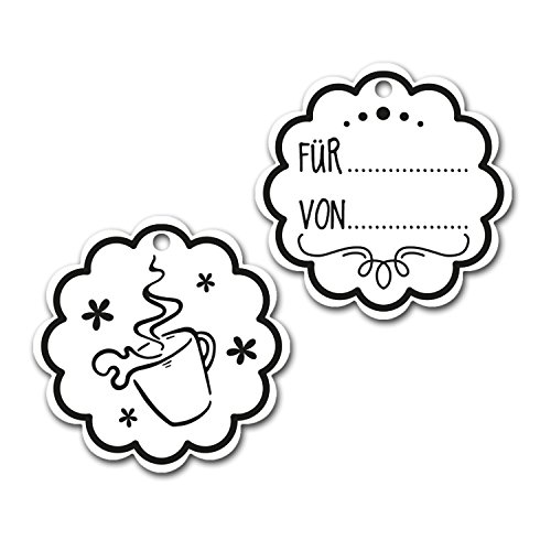 Kaffee-Tasse mit beidseitig bedrucktem Geschenk-Anhänger, mit einem Bändchen an den Henkel gebunden