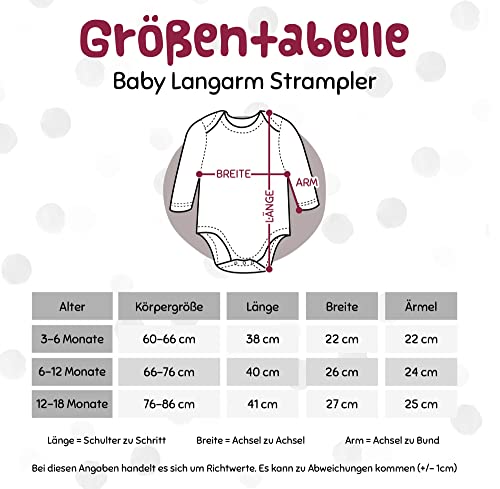 Die Größenangaben des Baby-Bodies sind in Monaten – so ist es für Oma, Opa, Tante, Onkel oder Freunde leichter als Geschenk zur Geburt, Taufe usw. die richtige Größe zu wählen und auch Mama und Papa tun sich vor allem am Anfang leichter, 3-6 Monate entspricht in etwa der Größe 60/66, 6-12 Monate 66/76, 12-18 Monate 76/86