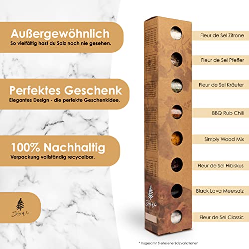 SIMPLY WOOD- Gourmet Salze, 8er Set Meersalz aus aller Welt (8x25g) ⭐ Dieses wunderbare Geschenkset enthält folgende Kompositionen: Fleur de Sel Zitrone ( Salz (Indische Sonnenflocken), Lemonmyrtle, Zitronenschalen ), Fleur de Sel Pfeffer ( Salz (Indische Sonnenflocken) , Tellicherry Pfeffer, grüner Pfeffer, Paprika, Knoblauch, Chipotle Chili ), Fleur de Sel Kräuter ( Salz 69%, Bio Rosmarin*, Bio Oregano*, Bio Thymian*, Bio Basilikum*, Bio Knoblauch*, Bio Pfeffer schwarz*), BBQ Rub ( Bio Paprika, Salz (Fleur de Sel), Bio Chili , Bio Knoblauch, Bio Zwiebeln, Bio Pfeffer, Bio Lemon Myrtle ), Fleur de Sel Safran mit Kurkuma ( Fleur de Sel, Kurkuma, Knoblauch und Safran ), Fleur de Sel Hibiskus ( Fiore di Sale (Salz) 80%, Bio Hibiskusblüten ), Schwarzes Meersalz aus Hawaii und Fleur de Sel.