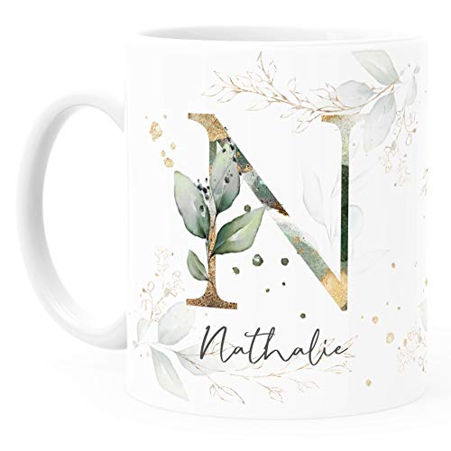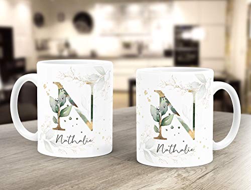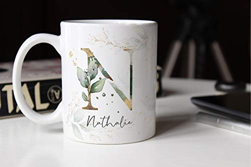 Wunderschöne Namenstasse mit zartem Lorbeerblatt-Dekor. Der Name und die Initale sind online individuell anpassbar. Wer ein besonderes personalisiertes Geschenk zum Geburtstag oder ein persönliches kleines Dankeschön verschenken möchte, macht mit dieser Tasse definitv alles richtig