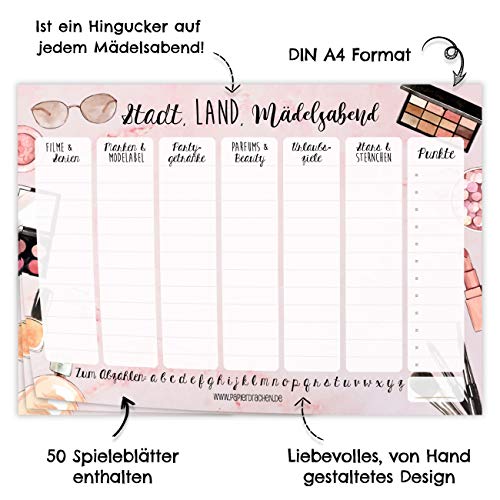 Spielblock für Erwachsene – Stadt-Land-Mädelsabend – für Zug, Autofahrt, Frauenabend, Junggesellenabschied – jeweils 50 Blatt auf hochwertigem Papier – Reisespiel – DIN A4
