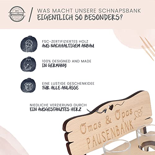 Details: Spruchreif · Schnapsbank mit Gravur · Schnapsbank für Eltern · Schnapslatte mit 2 Gläsern · Geschenke für Großeltern…