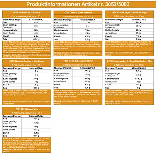 OSTPRODUKTE im Geschenk-Set: Puffreis Schokolade, Liebesperlenfläschchen, Othello Keks Wikana, Bonbons Bodeta Himbeere, Mintkissen Viba, Zetti Schlager Süßtafel, Viba Nougat Stange inkl. anlassbezogener Geschenkverpackung..