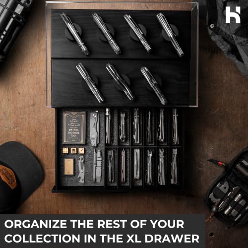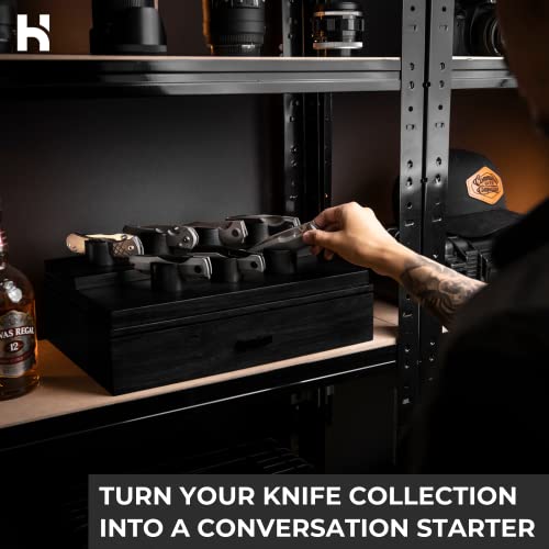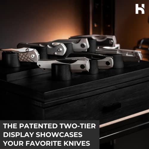 Ihre Lieblingstaschenmesser im Display – bewahren Sie Ihre Messer nicht in Geldbörsen mit Reißverschluss oder Schattenboxen auf und stellen Sie sie mit Stolz zur Schau. Dieser Taschenmesserhalter ist auch ein perfektes Valentinstagsgeschenk für Männer, bietet 7 Pfosten, um Ihre liebenswertesten Messer bis zu 14,7 cm zu präsentieren. Das patentierte zweistufige Design beinhaltet eine Schublade zur Aufbewahrung von zusätzlichen Messern, kleinen Werkzeugen, EDC-Getriebe und 12 zusätzlichen Klingen bis zu 12,7 cm.