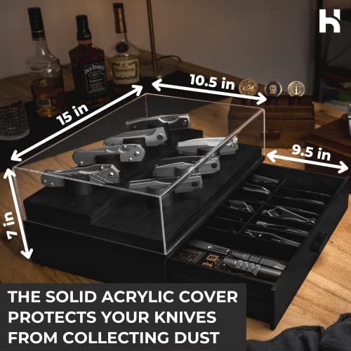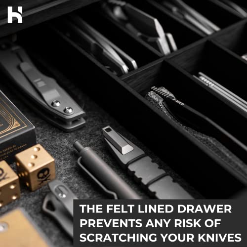 Schützen und konservieren — Mit diesem Messer-Display-Ständer werden Ihre Taschenmesser vor Staub und Kratzern unter der transparenten Acryl-Abdeckung und mit Filz ausgekleideten Schublade geschützt. Dieses hölzerne Messer-Display mit 360°-Sicht wurde unter engagierten Messerkollektoren getestet, um sicherzustellen, dass es Ihre Schutzbedürfnisse erfüllen würde.