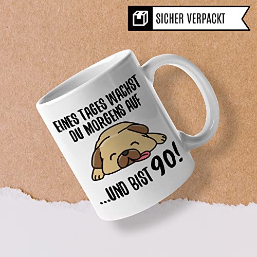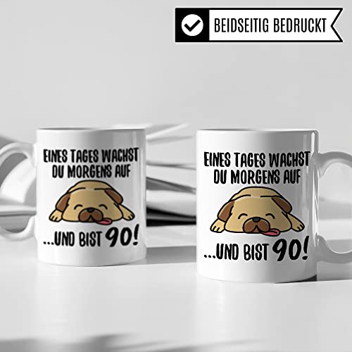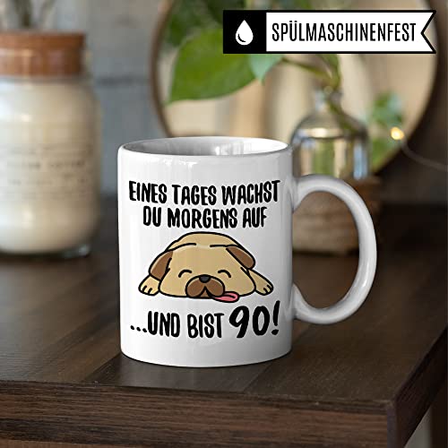 EINES TAGES WACHST DU MORGENS AUF …UND BIST 90! Lustige 90. Geburtstag Tasse aus weißer Keramik mit witzigem Spruch. Das ideale Geschenk zum 90. Geburtstag für alle Männer & Frauen, die Hunde lieben. Garantiert spülmaschinenfester Aufdruck – mit hochwertiger Sublimationstechnik bedruckt und deshalb besonders robust. Alle unsere Tassen werden zu 100% in Deutschland, zu fairen Bedingungen und mit Liebe bedruckt. Das ideale Geschenk, egal ob die Tasse als Kakaobecher, Kaffeetasse oder Kaffeebecher genutzt wird.