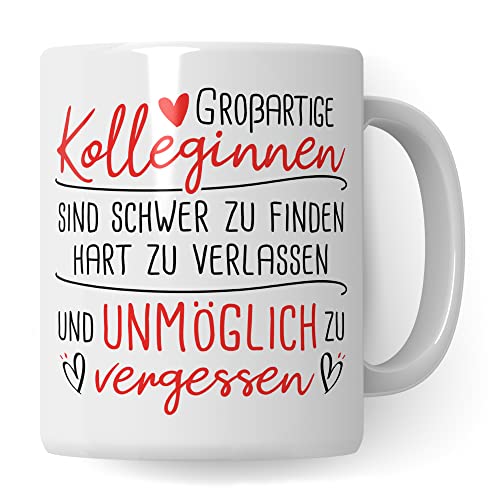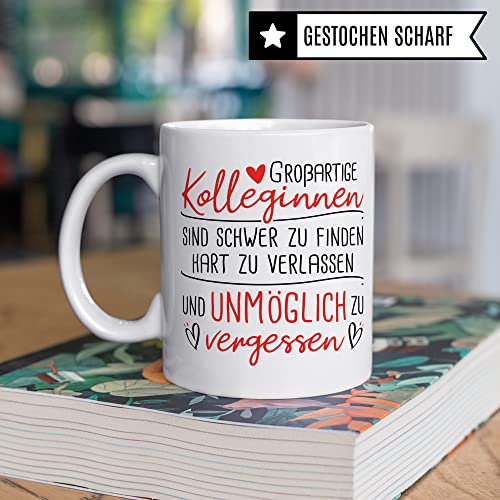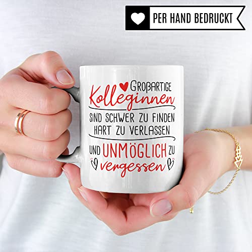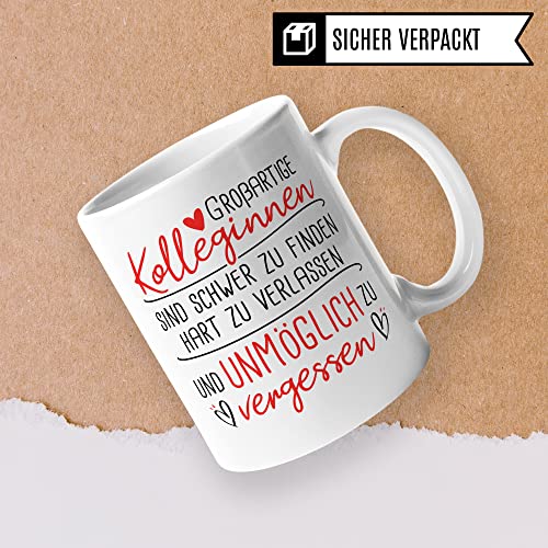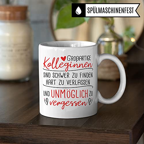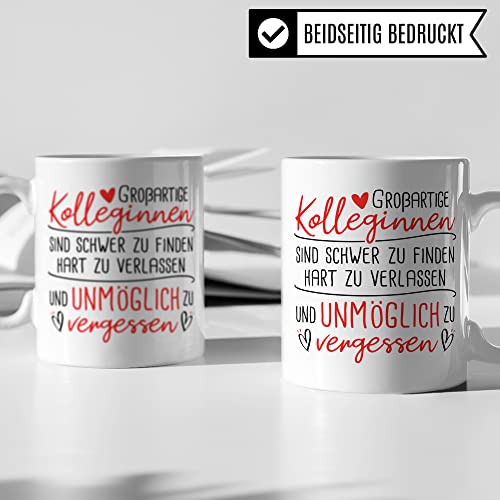 GROßARTIGE KOLLEGINNEN SIND SCHWER ZU FINDEN HART ZU VERLASSEN UND UNMÖGLICH ZU VERGESSEN! Tolle Kollegin Tasse aus weißer Keramik mit Arbeits-Kollege Spruch. Das ideale Geschenk für deine Lieblingskollegin zum Abschied, Rente, Renteneintritt, Verabschiedung, Jobwechsel! Garantiert spülmaschinenfester Aufdruck – mit hochwertiger Sublimationstechnik bedruckt und deshalb besonders robust. Alle unsere Tassen werden zu 100% in Deutschland, zu fairen Bedingungen und mit Liebe bedruckt. Das ideale Geschenk, egal ob die Tasse als Kakaobecher, Kaffeetasse oder Kaffeebecher genutzt wird.