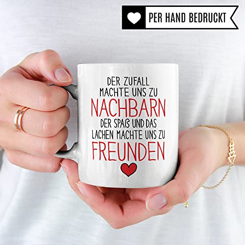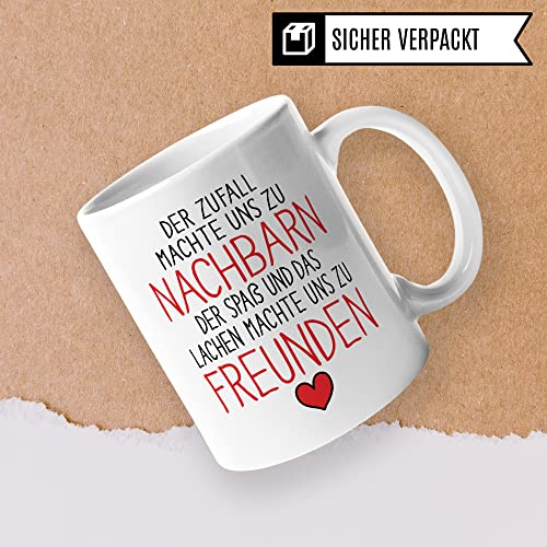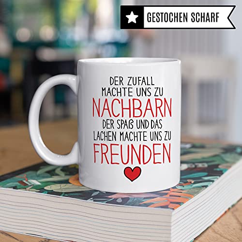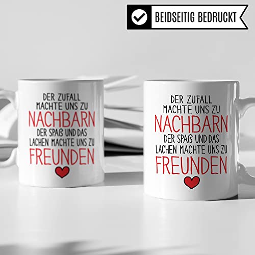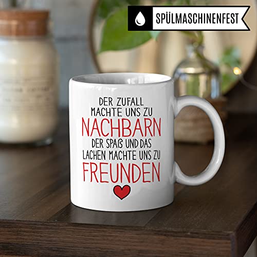DER ZUFALL MACHTE UNS ZU NACHBARN DER SPAß UND DAS LACHEN MACHTE UNS ZU FREUNDEN. Schöne Nachbarin Tasse aus weißer Keramik mit tollem Nachbarschaft Geschenk Spruch. Eine coole Geschenkidee für jede Nachbarin und jeden Nachbar, die inzwischen Freunde geworden sind. Ideal für alle Gelegenheiten, egal ob als Geburtstagsgeschenk zum Geburtstag oder als letztes Nachbarschaftsgeschenk zum Abschied. Garantiert spülmaschinenfester Aufdruck – mit hochwertiger Sublimationstechnik bedruckt und deshalb besonders robust. Alle unsere Tassen werden zu 100% in Deutschland, zu fairen Bedingungen und mit Liebe bedruckt. Das ideale Geschenk, egal ob die Tasse als Kakaobecher, Kaffeetasse oder Kaffeebecher genutzt wird.