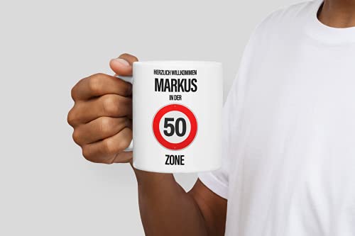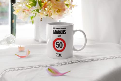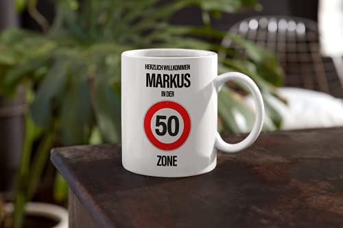 Das perfekte individuelle Geschenk zum 50. Geburtstag. Beidseitig bedruckte personalisierte Keramiktasse mit Spruch Herzlich Willkommen Wunschname in der 50er Zone