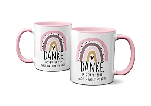 – Schwarze Tasse beim blauen Regenbogen, Rosa Tasse beim rosa Regenbogen und der Aufschrift „Danke, dass du mir beim Wachsen geholfen hast“