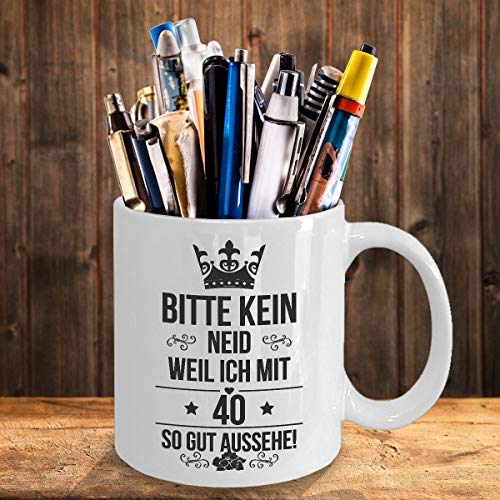 Langlebiger Aufdruck mit dem lustigen Spruch „Bitte kein Neid weil ich mit 40 so gut aussehe“.