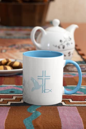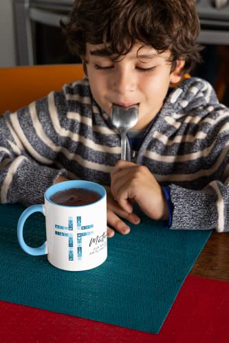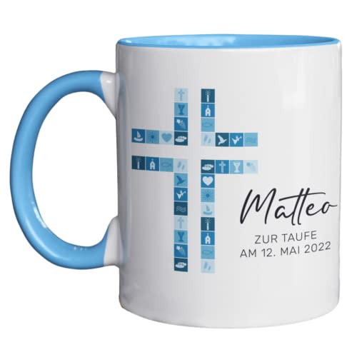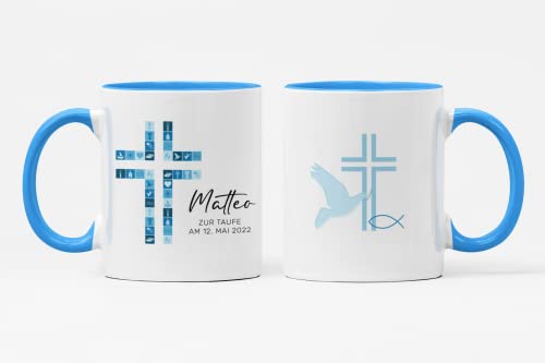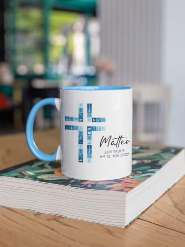 Details: Tasse zur Kommunion/Konfirmation/Firmung mit Aufdruck des Namens und Wunschtext für Mädchen und Jungs (Blau)