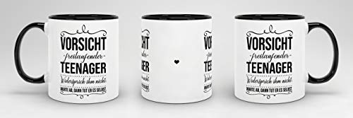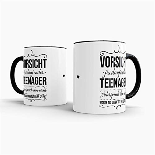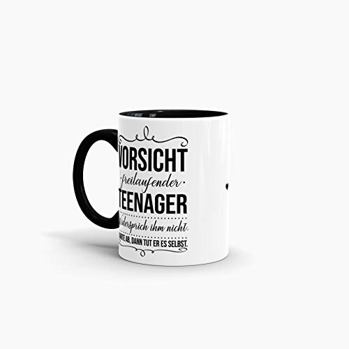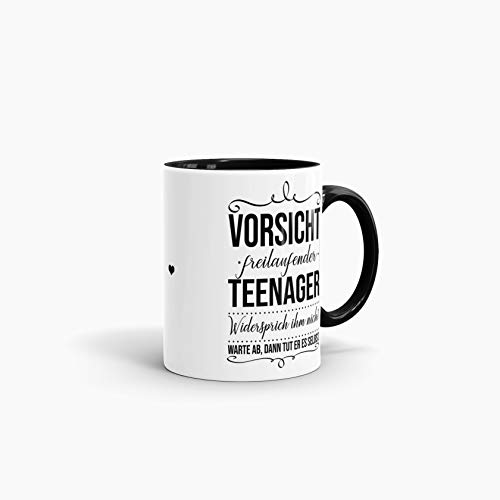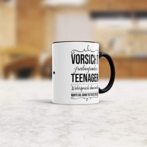Details: Tassendruck Geschenk-Tasse zur Jugendweihe Vorsicht freilaufender Teenager – Erwachsen/Kind/Feier/Innen & Henkel Schwarz