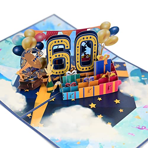 Details: TOG BEG® 3D Pop-up Grußkarte mit Nummer 60 und Dekolationen wie Luftballon, Geschenke und ein Grammophon zum 60…