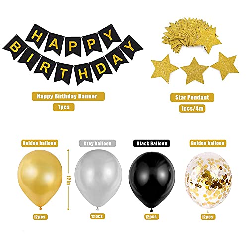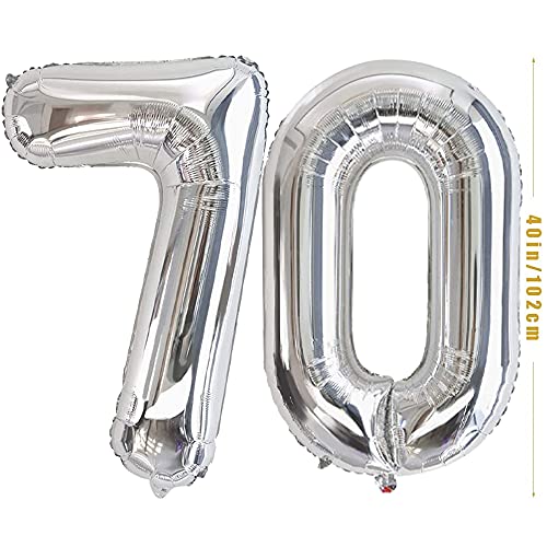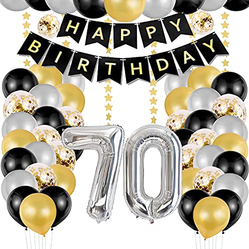 🎀 Packge enthalten: XXL Silber 70 Folienballon 40″ (101cm)+ 1 x Happy Birthday-Banner + 12 x 12 Zoll aus schwarzem Perlglanzlatex +12 x 12 Zoll aus goldenem Perlglanzlatex+ 12 x 12 Zoll aus Silber mit Perlglanzlatex + 12 x 12 Zoll Konfetti Luftballons + 4m Stern Ornamente+2 Rollen Bänder.