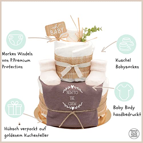 Details: Trend Mama – Vintage Boho Windeltorte Neutral | New to the Crew – Baby Body braun + beige Baby Kuschelsocken…