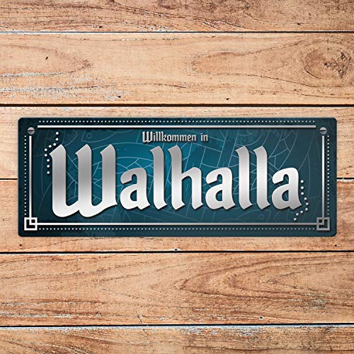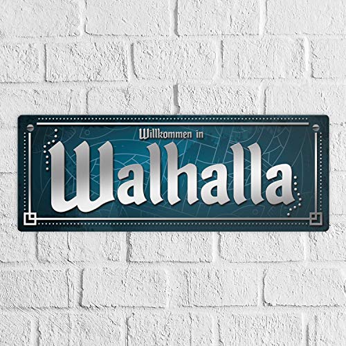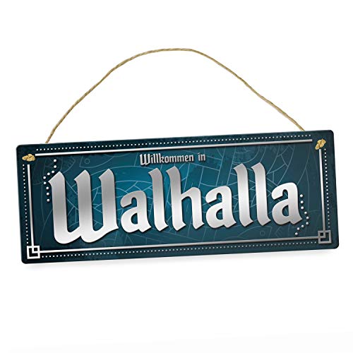 Durch den metallenen und marmorhaltigen Stil, den das Schild prägt, tritt jeder tapfere Krieger ehrfürchtig nach Walhalla ein.Das Schild eignet sich in seinem breiten Format besonders gut als Tür- oder Wohnungsschild und kann beispielsweise mit doppelseitigem Klebeband, Schrauben, Nägeln oder einer Schnur zum Aufhängen befestigt werden (Befestigungsmaterial nicht im Lieferumfang enthalten).