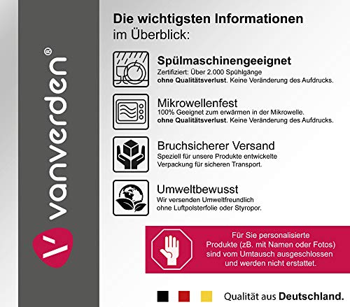 Spülmaschinenfest (2.000 Spülgänge), Mikrowellen beständig und nach DIN geprüft sind die prägnantesten Eigenschaften, die die Tasse besonders machen. Egal ob Handwäsche oder Industrie Spülmaschinen, der Aufdruck bleibt immer unverändert.