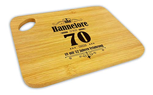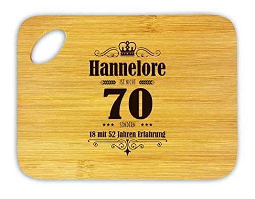 Das Schneide- bzw. Vesperbrettchen aus Bambus mit Wunschnamen z.B. „Hannelore (bzw. Wunschname) ist nicht 70 – sondern 18 mit 52 Jahren Erfahrung“ sieht toll aus und ist ein praktisches Geburtstagsgeschenk zum Siebzigsten, das ganz individuell mit dem gewünschten Namen personalisierbar ist.