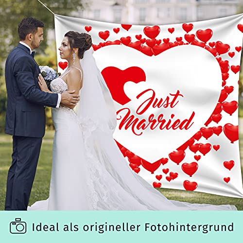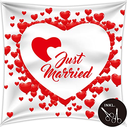 BLICKFANG – Das Laken mit Herzmotiv mit Aufdruck „Just Married“ in Größe 240 x 180 cm aus fein glänzendem Stoff setzt jedes Hochzeitspaar in Szene. Als Hintergrund für Fotos mit dem Brautpaar und Hochzeitsspiel mehrfach verwendbar.