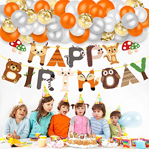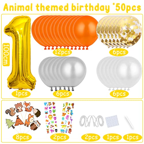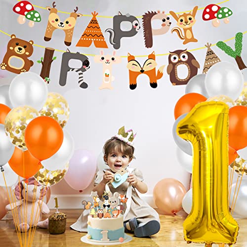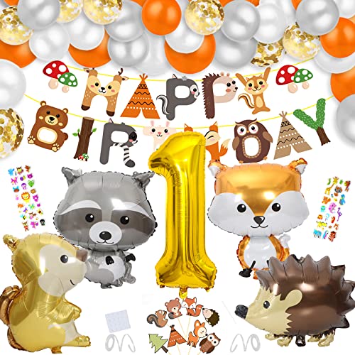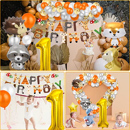 🎈【1 jahr Waldtiere Geburtstag Deko Set】1 x Gold 40inch XXL Riesen Folienballon “1”, 12 x Orange Ballon,6 x Weiß ballon, 6x Silber Ballon, 6x Gold Konfetti Ballons, 1 xTier Happy Birthday Girlande, 4 x Tierischer Folienballon( Fuchs, Eichhörnchen,Igel,Waschbär ),8 x Tiere Cake Topper, 2 x Tiere 3D-Aufkleber,2 x Silber Ballon bänder ,1x Klebepunkt.
