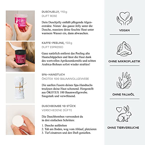 🛁 INHALT 14-TEILIGES WOHLFÜHL-SET: 2x Duschjelly (110g), 1x Kaffe-Peeling (150g), 2x Duschbombe Fichte, 2x Duschbombe Lavendel, 2x Duschbombe Eukalyptus, 2x Duschbombe Orange, 2x Duschbombe Rose, 1x SPA-Handtuch