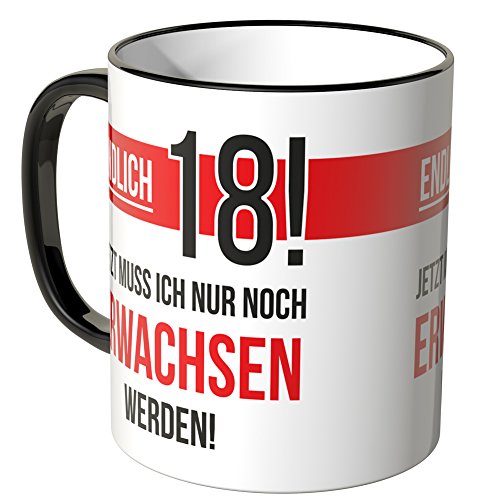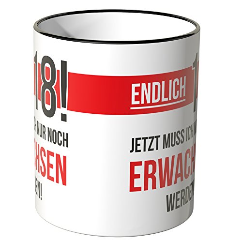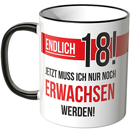 Exklusive Wandkings Keramiktasse mit Schriftzug: Endlich 18! Jetzt muss ich nur noch erwachsen werden! – MOTIV 2. Made in Germany!