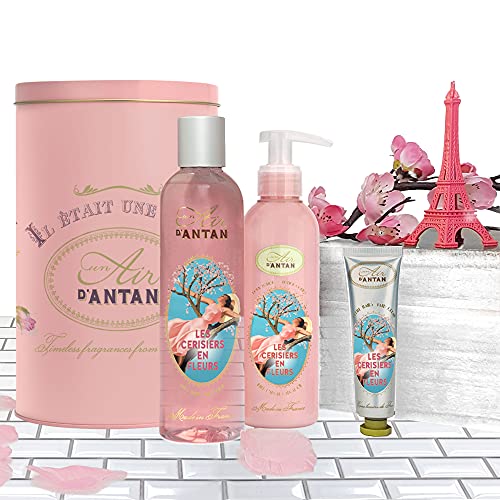 🌸 Dieses Pflegeset Damen enthält enthält 3 Produkte: 1 Duschgel 250 ml, 1 Körperlotion 200 ml, 1 Handcreme 25 ml in einer schönen Metallkarussell Box. unsere Kirschblütendüfte mit Noten von Frühlingskirschblüten und Freesie.