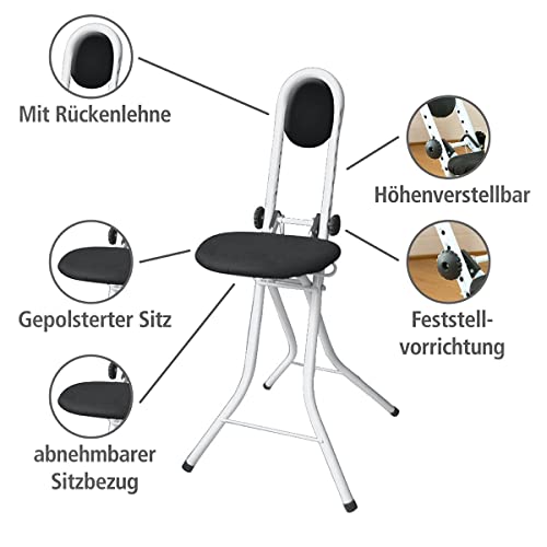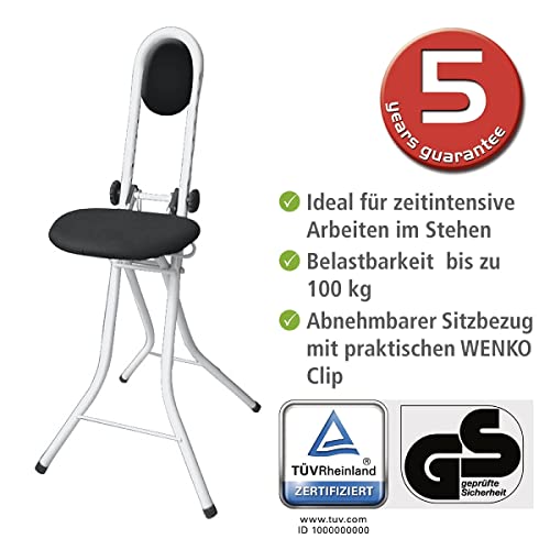 Angenehme Polsterung: Der Stehstuhl verfügt über ein Rückenpolster und eine gepolsterte Sitzfläche von 30,5 x 24 cm. Den Sitzbezug aus 100% Baumwolle können Sie dank des praktischen WENKO-Clips abnehmen und bei 30° in der Waschmaschine waschen.