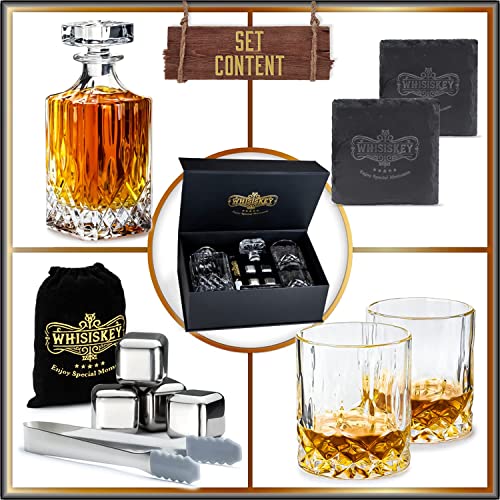 ✅ KOMPLETTES SET – Whiskey karaffe – 1000 ml – 4 Whiskeysteine – 2 Whisky Gläser – Zange – Gläserner Stopfen