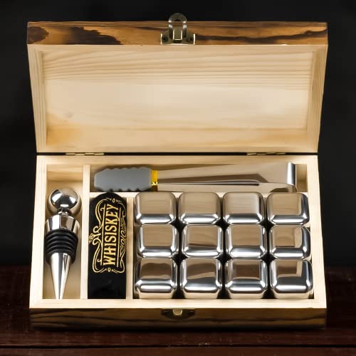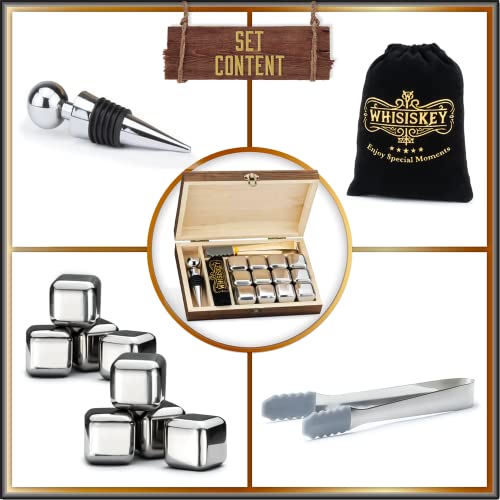 Details: Whisiskey – Whisky Steine Set – 12 Edelstahl Whiskey Steine, Flaschenverschluss & Zange – Geschenke für Männer…