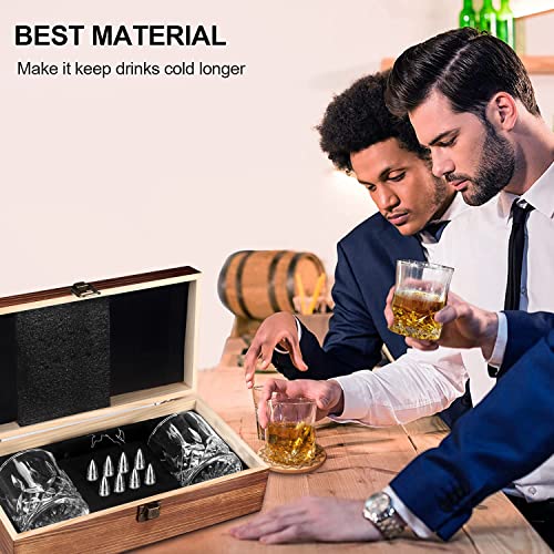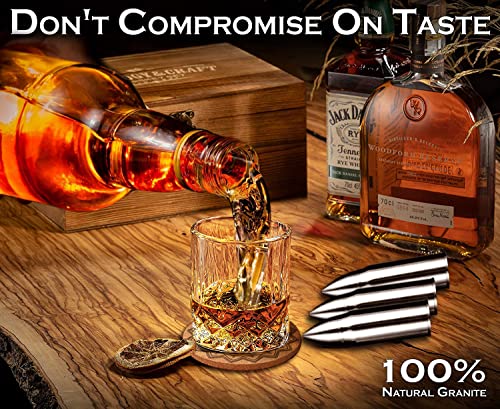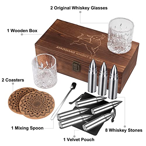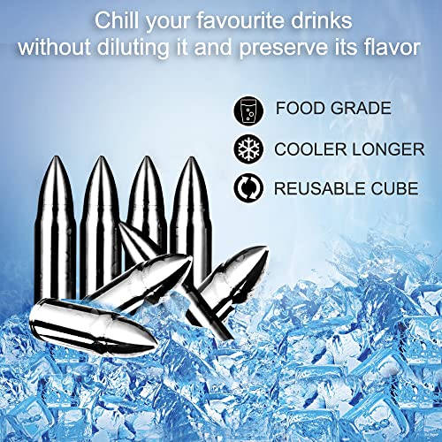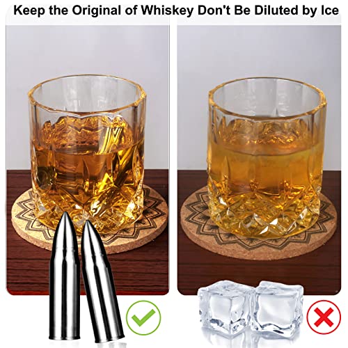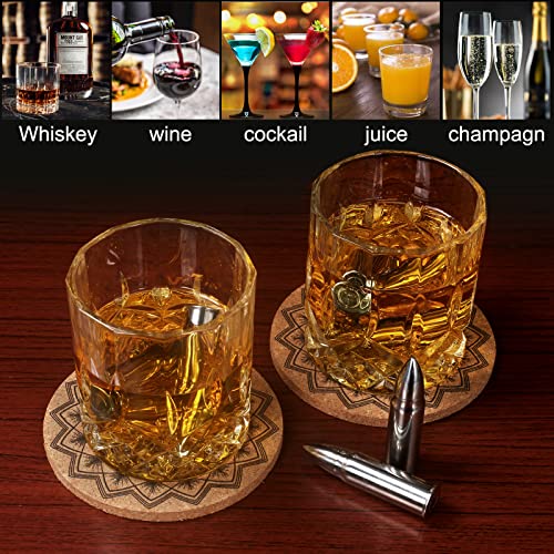 【WAS SIE ERHALTEN】- Dieses Whisky steine-set enthält 8 wiederverwendbare patronenförmige edelstahl-eiswürfel + aufbewahrungstasche + 2 untersetzer + 2 whiskygläser + 1 löffel + eine geschenkbox.