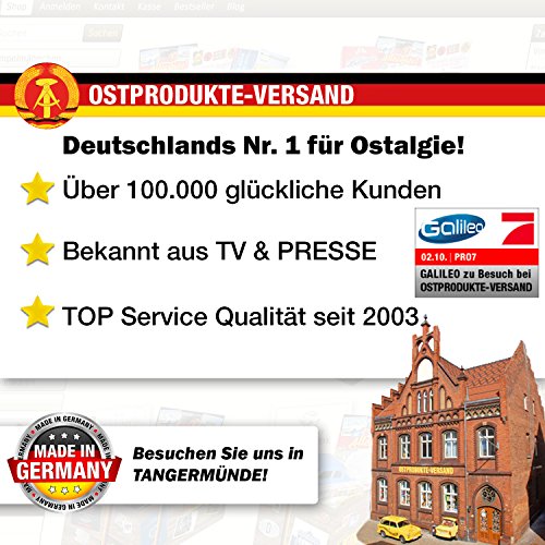 In diesem DDR Geschenkset befinden sich originelle Produkte aus dem Osten. Fertig zum Verschenken mit edler Geschenkbox. Bekommen – Öffnen – Genießen und die Erinnerungen aufleben lassen. Lassen Sie es sich schmecken. Verschenken Sie ein bisschen Ostalgie in der passenden DDR Box. Fügen Sie noch weitere DDR Waren hinzu. Die Geschenkbox ist wiederverschließbar.