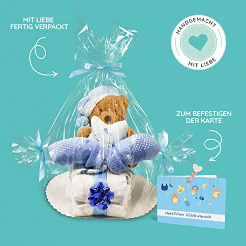 Details: Windeltorte Motorrad in Blau mit Kuscheltier für Junge, Pinkelparty Geschenke zur Geburt, Taufe oder Baby-Party…