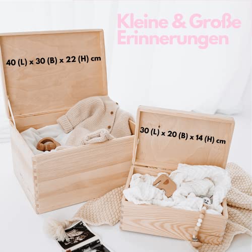 PERFEKTE GRÖSSE – Die Holzkiste mit Gravur ist das perfekte Baby Geschenk. Die Größe der Erinnerungsbox beträgt 30 x 20 x 14 cm und ist aus hochwertigem, FSC-zertifizierten Kiefernholz gefertigt.