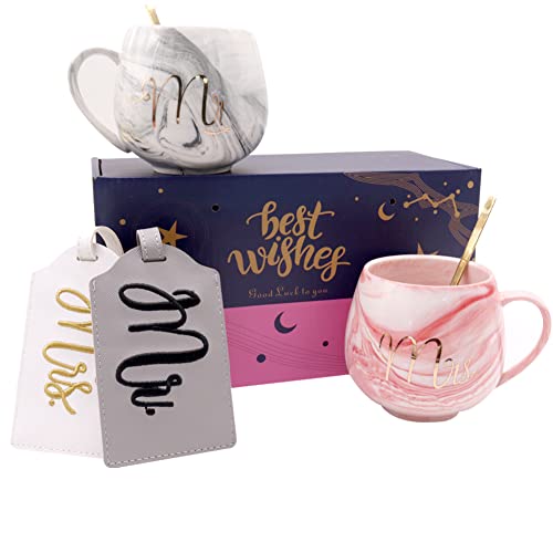 【Luxus Exquisit Geschenkbox verpackung】- MR MRS Kaffeetassen Set, 1 x grauer Mr Becher, 1 x rosa Mrs Becher, 2 x Löffel, 2 x Herr und Frau Gepäckanhänger